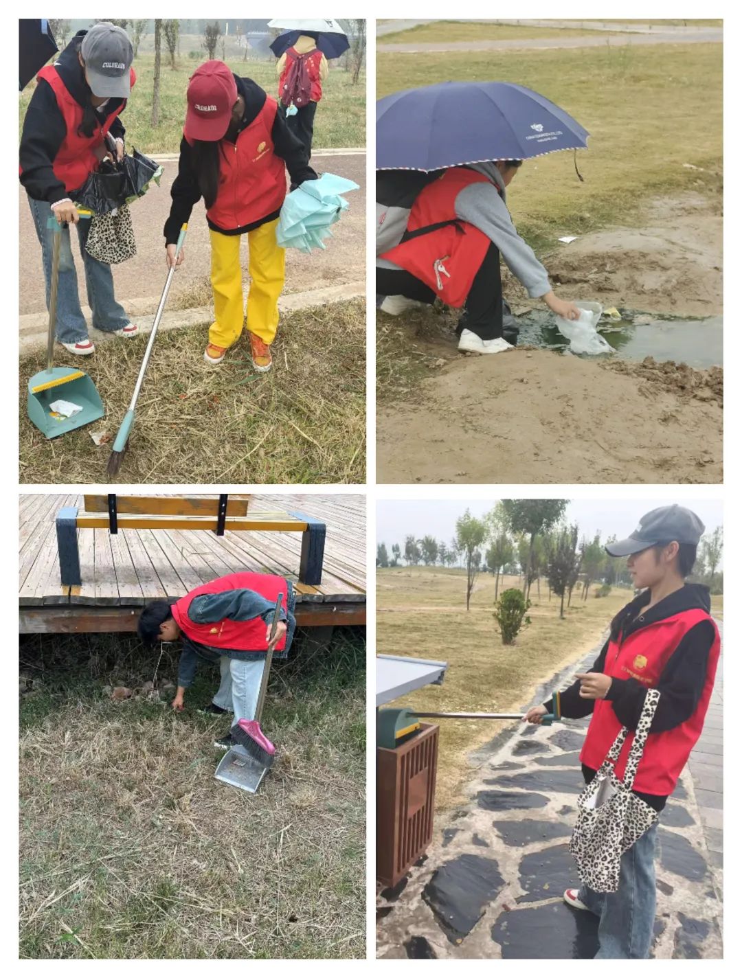 志愿者们化身“护河卫士”身穿红色志愿服,手持清洁工具,分工合作、相互配合,清理枯枝落叶、塑料袋等垃圾。