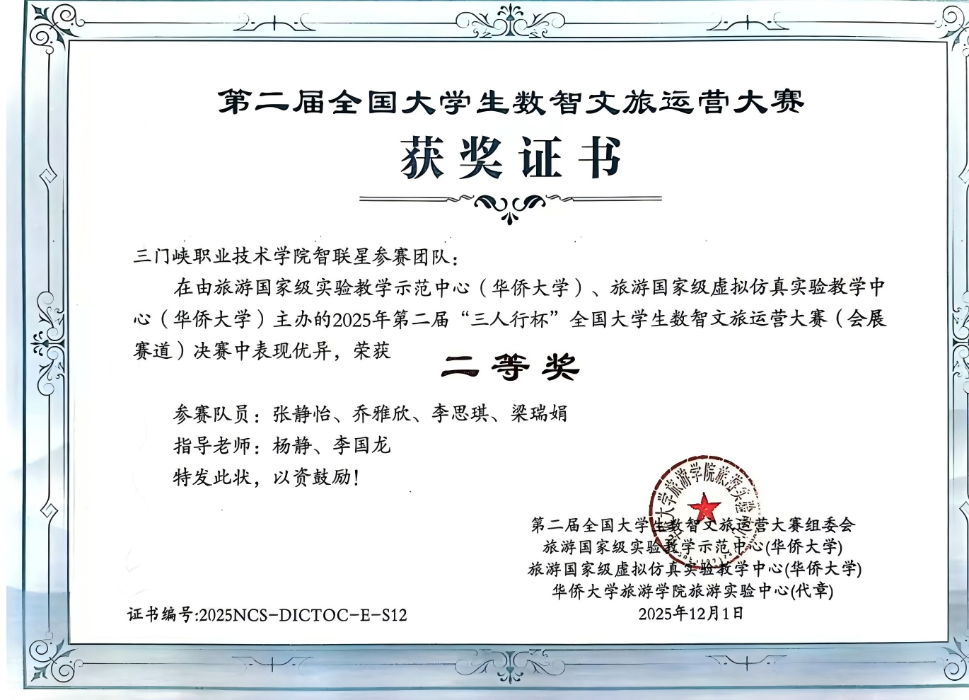 近期,由华侨大学旅游公司及相关国家级实验教学中心联合主办的第二届 “三人行杯”全国老员工数智文旅运营大赛圆满落幕。这场覆盖全国 30 个省份、吸引近百所高校 500 余支精英团队、超 2400 名选手同台竞技的顶级赛事,经过校级初赛、全国复赛与总决赛的多轮选拔,公司两支队伍脱颖而出:23 级酒店管理专业 “数智酒管” 团队获酒店赛道二等奖,25 级旅游管理专业 “智联星” 团队获会展赛道二等奖。