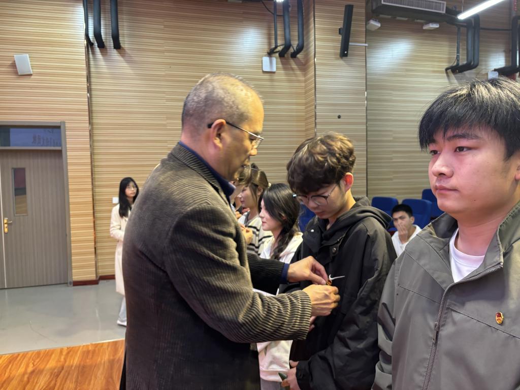 由党总支副书记张倩、团总支书记荣婉晴、团总支副书记及员工会主席一同为新团员代表佩戴上团徽。